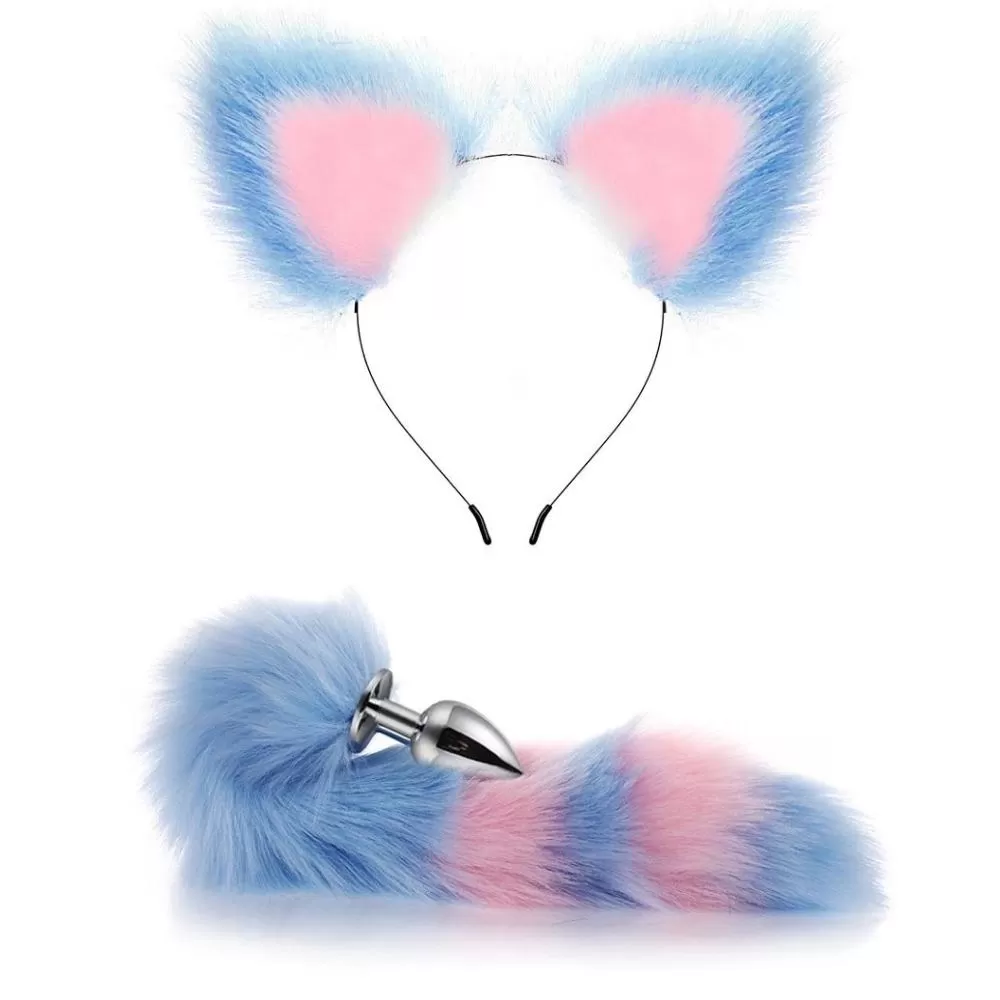 Choker Klips Tüylü Kulak Seti Pembe Mavi Kedi Kuyruklu Paslanmaz Çelik Anal Butt Plug