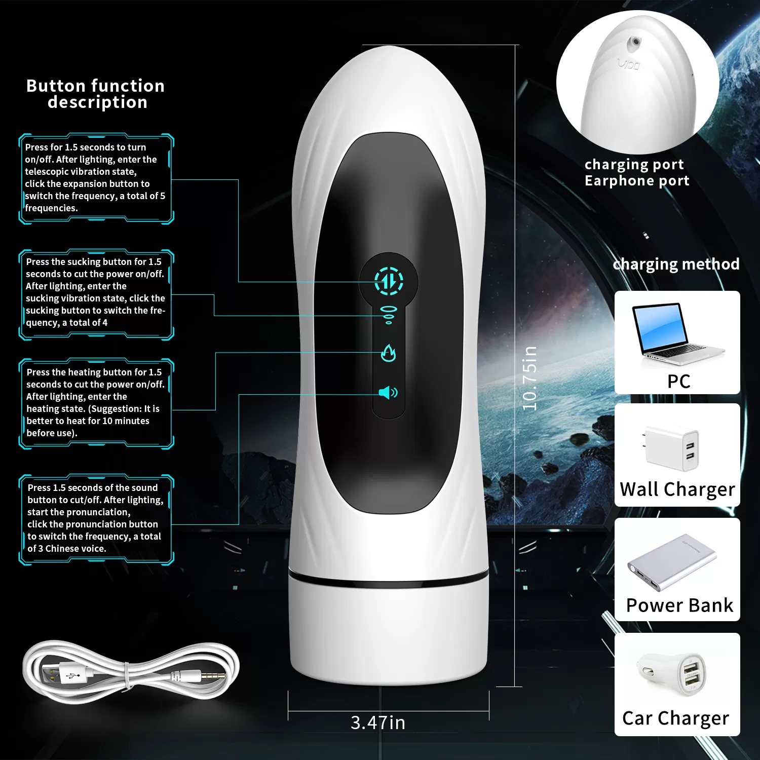 Erkeklere yönelik bu seks oyuncağı, paslanmaz çelik santrifüj pervane ve yüksek hızlı motorlu vibratörü ile vakum emme teknolojisinden oluşur. Tüm işlevler bağımsız olarak kontrol edilir, bunları aynı anda açabilir veya yalnızca işlevlerden birini kullanabilirsiniz.
